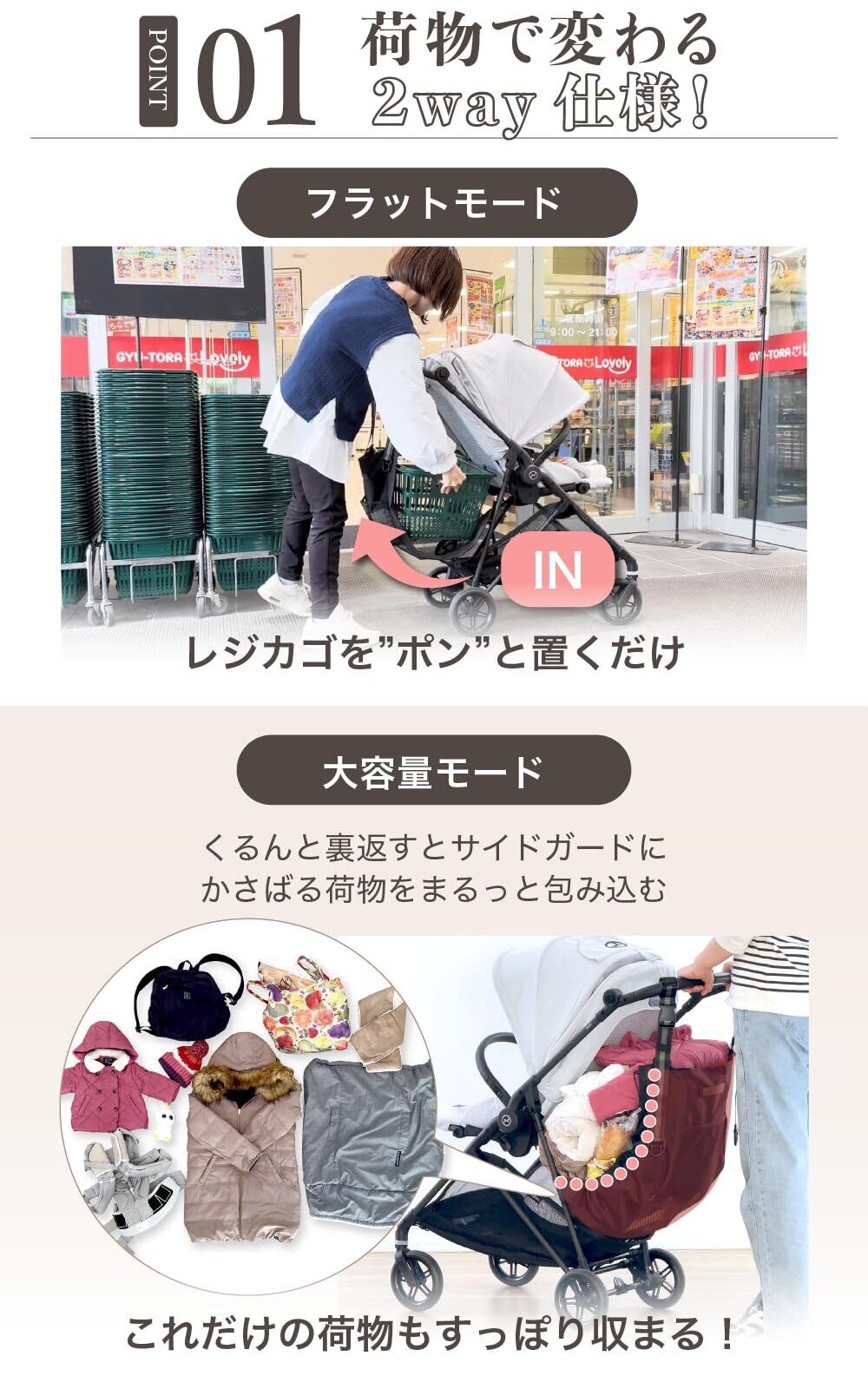 【レジカゴがそのまま入る!2WAYで自由自在】モックルンの最大の特徴は、使うシーンに応じて形を変えられる2WAY仕様であること。スーパーでのお買い物時にはフラットモードにすれば、レジカゴをそのままベビーカーに載せて運べる構造になっています。カゴの置き場所に悩まずスムーズに買い物ができます。公園やお出かけ先などでかさばるバッグや衣類を運びたいときには、両サイドのサイドガードをくるんと裏返して大容量モードに切り替え可能。抱っこ紐、上着、ブランケットやおもちゃなど、まるごと包み込むように収納できます。毎日変化する子育てシーンに柔軟に対応する、頼もしい味方です。