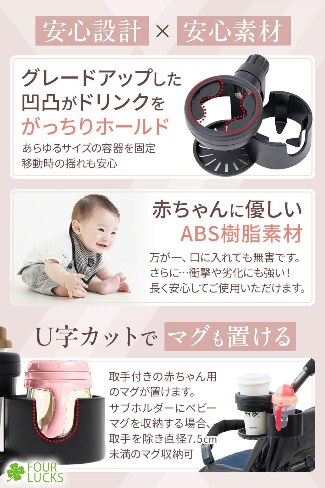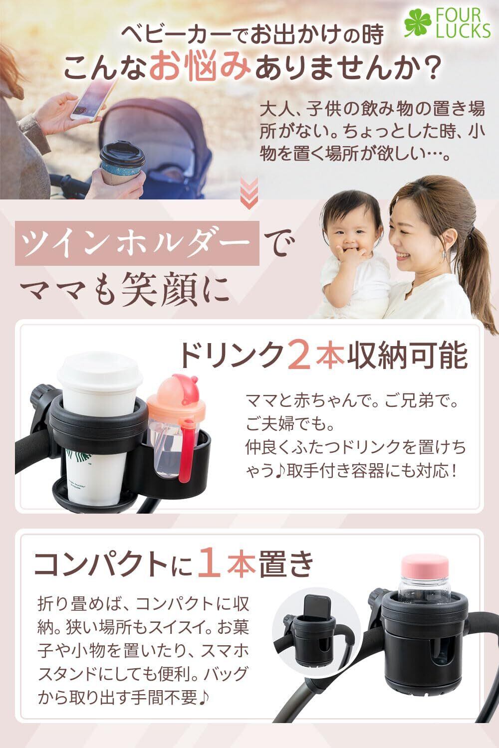 「【現役保育士推薦】FOUR LUCKS ベビーカー ドリンクホルダー」は、お子さまとのお出かけをより便利にする画期的なアイテムです!ママやパパが必要な飲み物やスマホを安全に収納でき、育児ライフをサポートします。