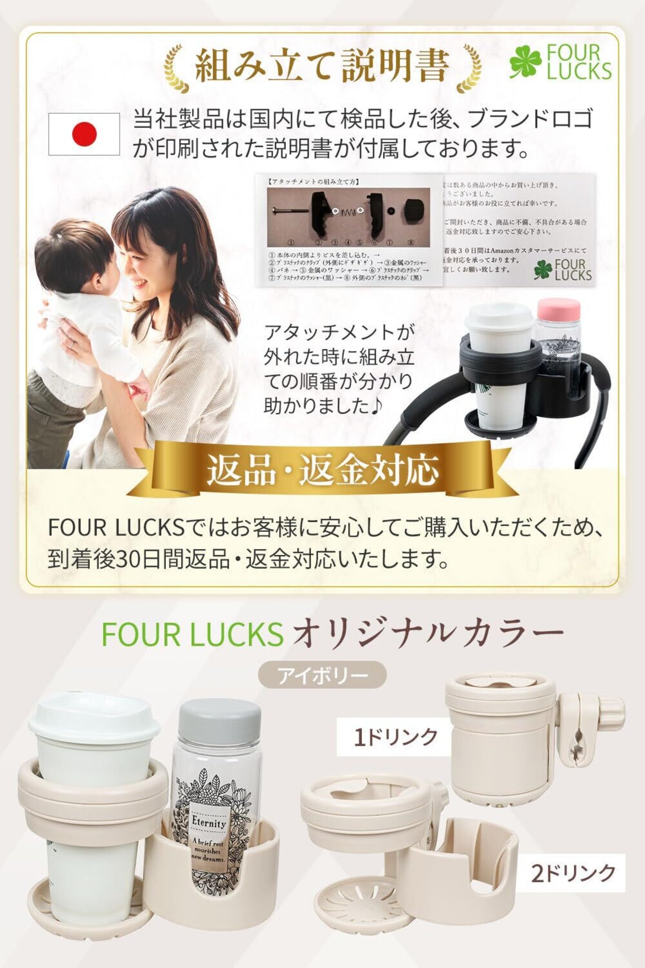 FOUR LUCKSのドリンクホルダーは、ベビーカーに簡単に取り付けられる設計です。特別な工具は不要で、急なお出かけ時にもすぐに装着できるので、忙しいママ・パパにとって安心です。