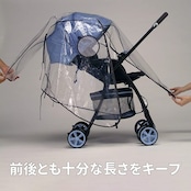 本製品は幌付きベビーカー用レインカバーです。前面が全開するので乗り降りが楽です。ダブルファスナーなのでベビーカーが対面時も背面時も使用できます。ファスナーは部分開き可能。雨の中でもケアーができます。前後左右ともすっぽり包む十分な長さがあるのでいろいろな形式・サイズのベビーカーに対応します。