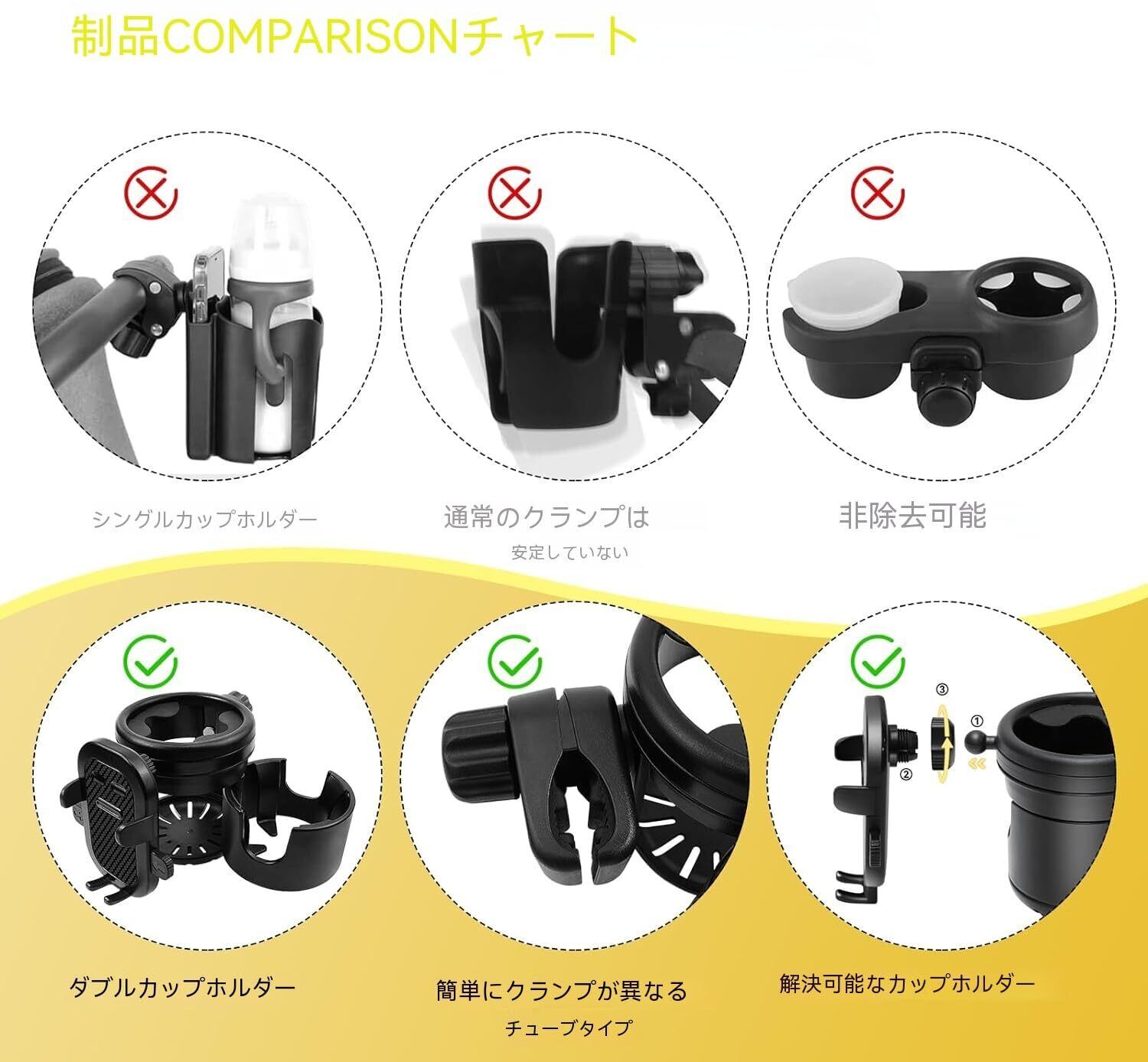ベビーカードリンクホルダー スマホ対応 2in1 カップホルダー 哺乳瓶 飲み物 ホルダー キッズ ボトルホルダー 360度回転 角度調整 取り付け 収納便利 携帯電話収納 ペットボトル 水分補給 (ブラック) | yankees