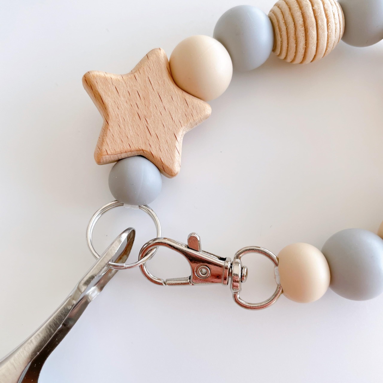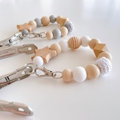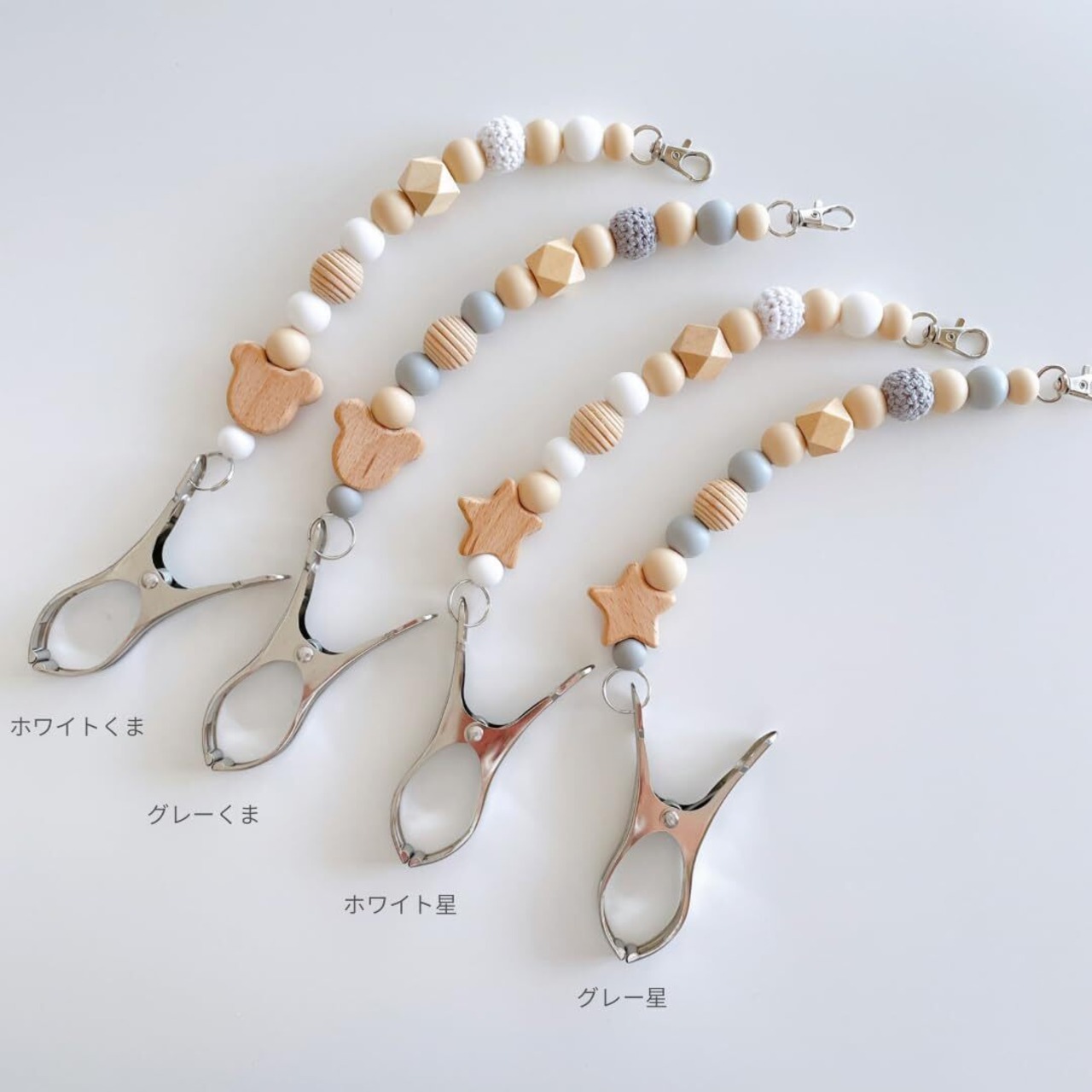Lulu & Fleur(ルルフルー)ナチュラルカラーと木製のお星様またはくまさんが可愛らしいシューズクリップです。おしゃれで便利にお子様のお靴を持ち運びしていただけます。【サイズ】長さ:ループの状態約19cm、伸ばした状態約31cm 厚さ:約2cm、幅:約5〜6cm、重さ:約38g【カラーバリエーション】 ホワイト×星 ホワイト×くま グレー×星 グレー×くま
