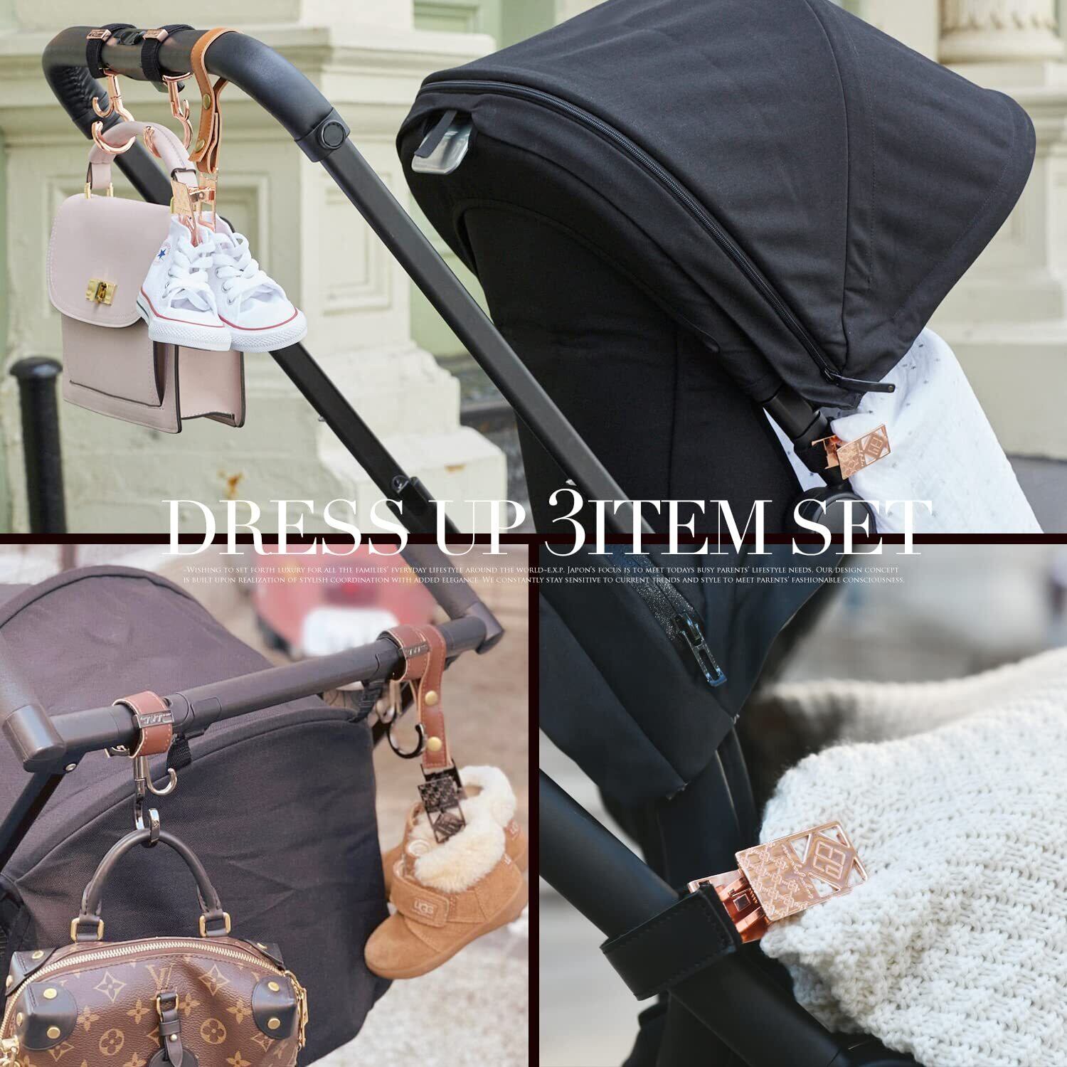 ベビーカーをDressUpするe.x.p.japonのバギーフック&ブランケットクリップ&シューズクリップのオシャレな3点セット。インスタグラムや雑誌での紹介も多数!著名人にも愛用いただいているアイテムです高級感のあるデザインで出産祝いのギフトにもおすすめ! ■国際特許取得済 (Int'l Patent Registered/国际专利取得) ■意匠登録済 (Design Registered/设计专利取得)