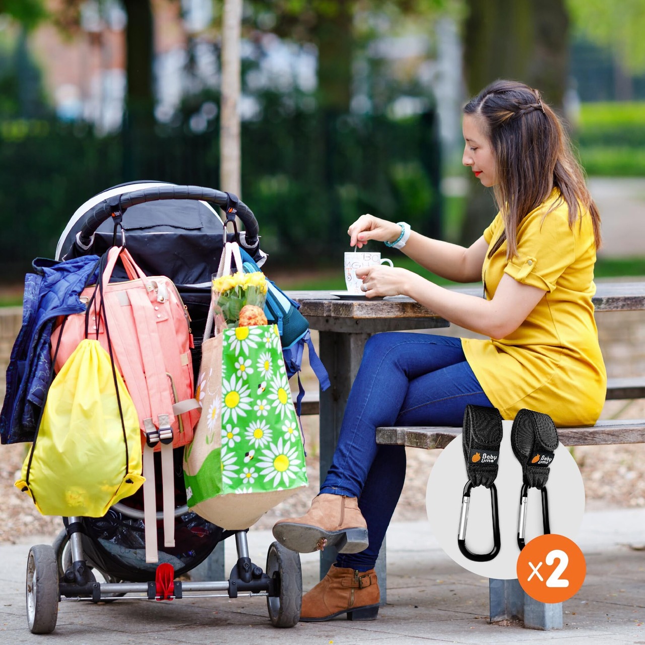 手が足りない時に:すべての物を持ち運ぶ必要がある時も、ベビー用品をいくつか手元に置いておきたい時も、このベビーカーフックがあれば、ベビー用品を必要な場所にすべて収納できます。