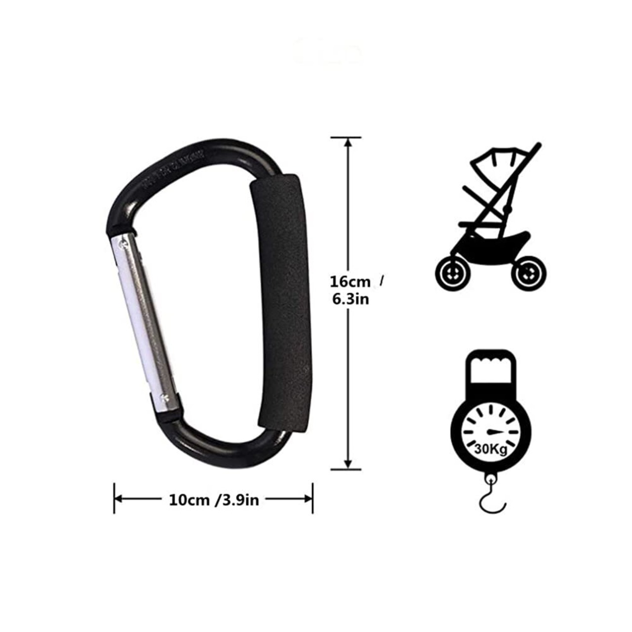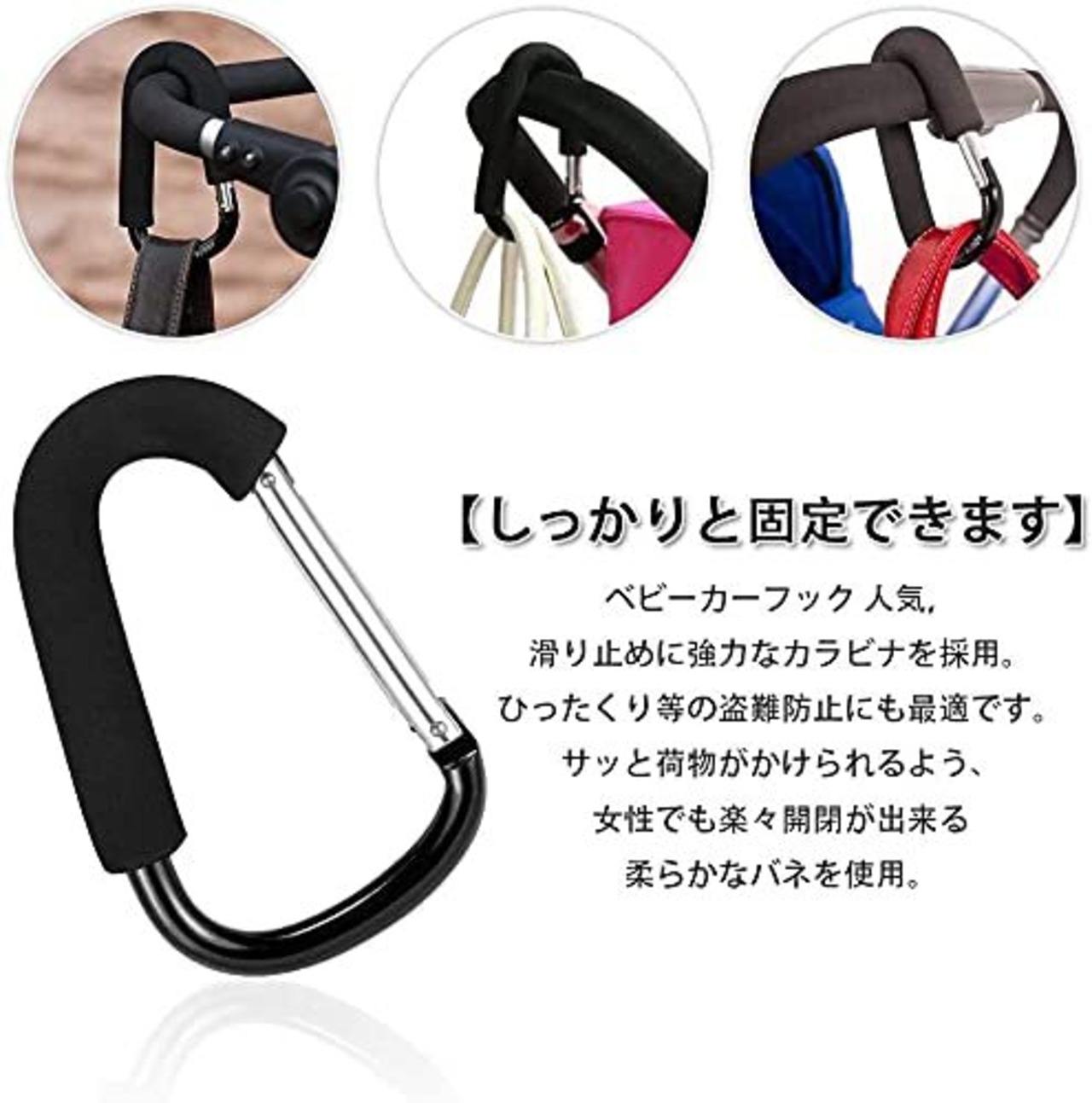 【しっかりと固定】高強度で強靭性を備えて、重たい買い物袋などの固定用に広く使われています。ベビーカーフックは荷物を軽くし、持ち安くなるだけではない、ベビーカーの収納スペースにも役立ちます。