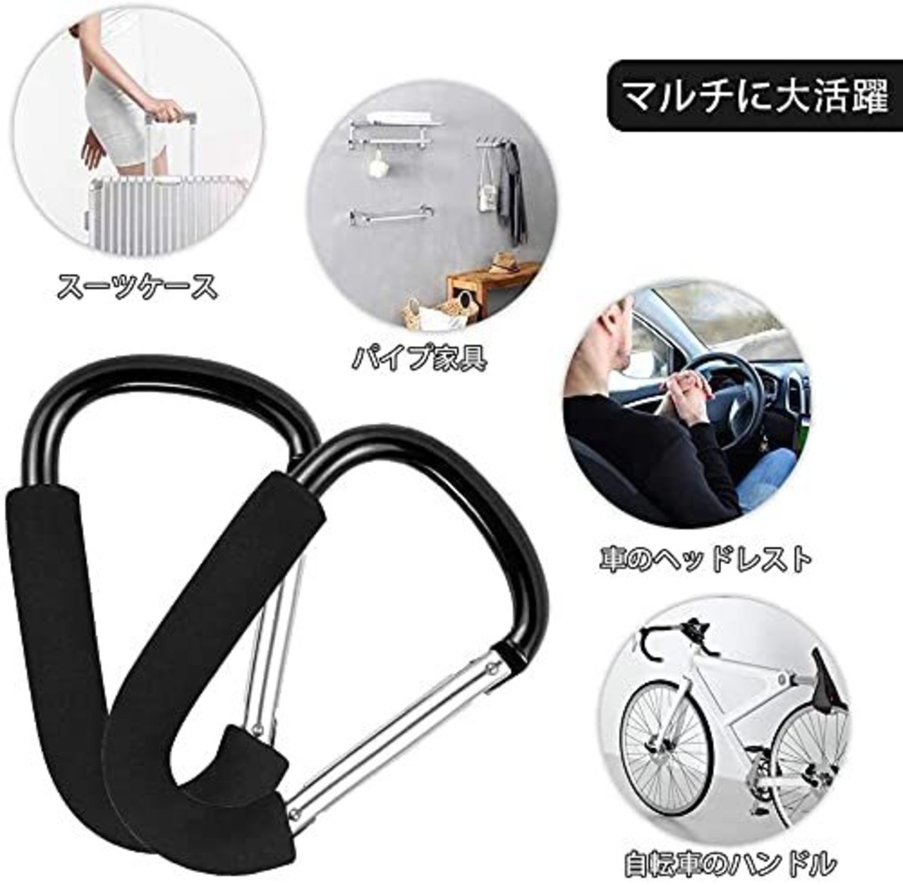 【ユーザーフレンドリーなデザイン】アルミニウム製のカラビナタイプなので割れたり欠けたりの心配がいらず、丈夫で安心できる仕様です。クッション性のあるグリップ付きなので、滑りにくく、握りやすい。重い荷物をまとめて持つ際にも持ちやすい設計です。