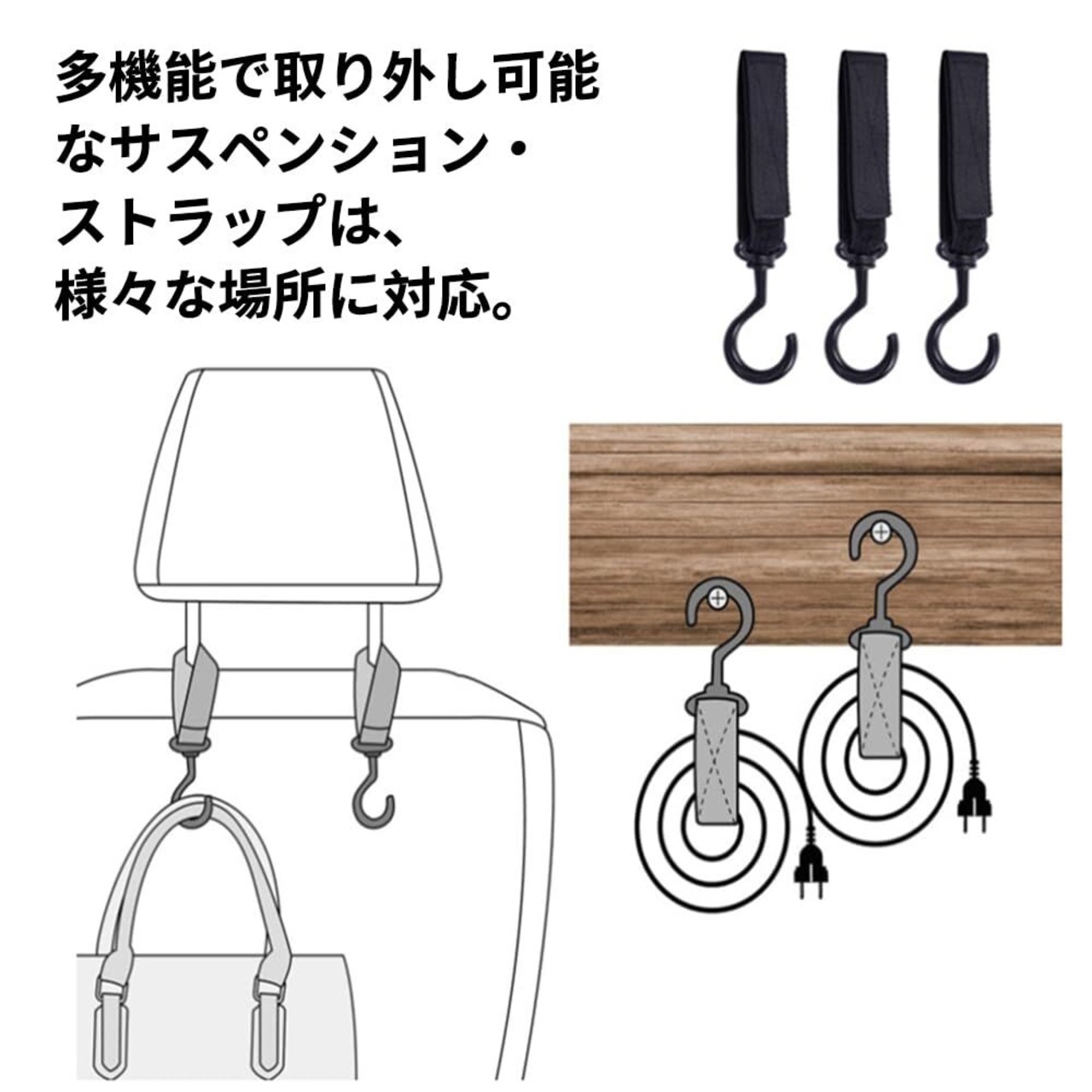 1.【セット内容】材質:ナイロン/ベルト、ポリアセタール樹脂/フック、数量:3本セット、カラー:ブラック 2.【 耐荷重約10kg 】約10kgまでぶら下げることができます。車用だけでなく、ベビーカーやスーツケース、バイクなど様々な用途でお使いいただけます。 3.【360度回転フック】フック部分が360度回転できるので、装着後のフックの向きが逆でも、フックの向きだけを変えればOKで、装着し直す必要がありません。 4.【便利】ため手軽に着脱することができ、太さに合わせて調整もできるため車内のみならず、家具やベビーカーの持ち手など様々な場所にお使い頂けます。 5.【幅広い適用】ベビーカー、自転車のハンドル部分、キッチン回り、パイプヘッド、スーツケース、カートなど幅広くマルチに使用可能なんです。