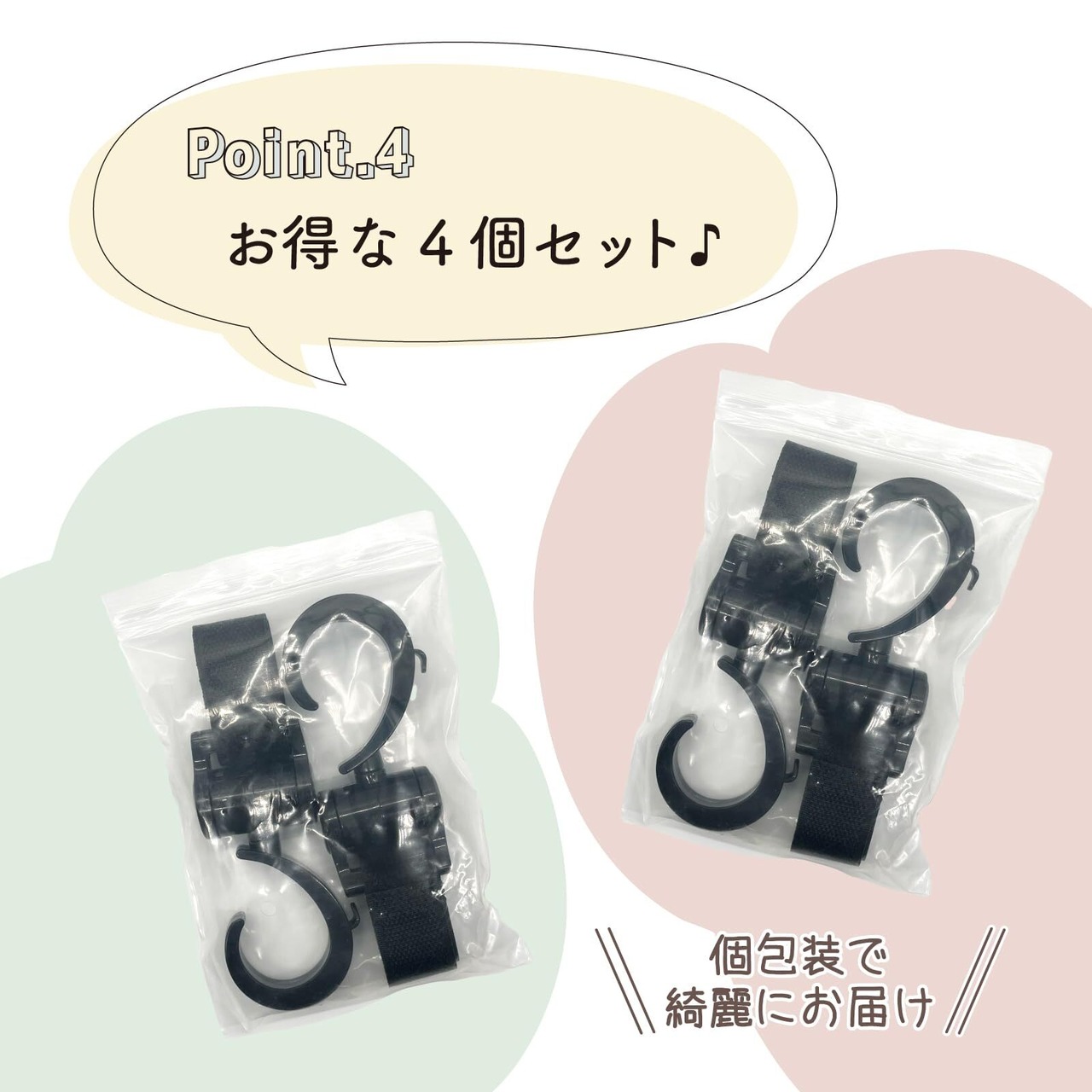フック ベビーカーフック 【4個セット】 360度回転 耐荷重20㎏ マルチフック 荷物フック マジックテープ 車 自転車 物干し竿 個包装