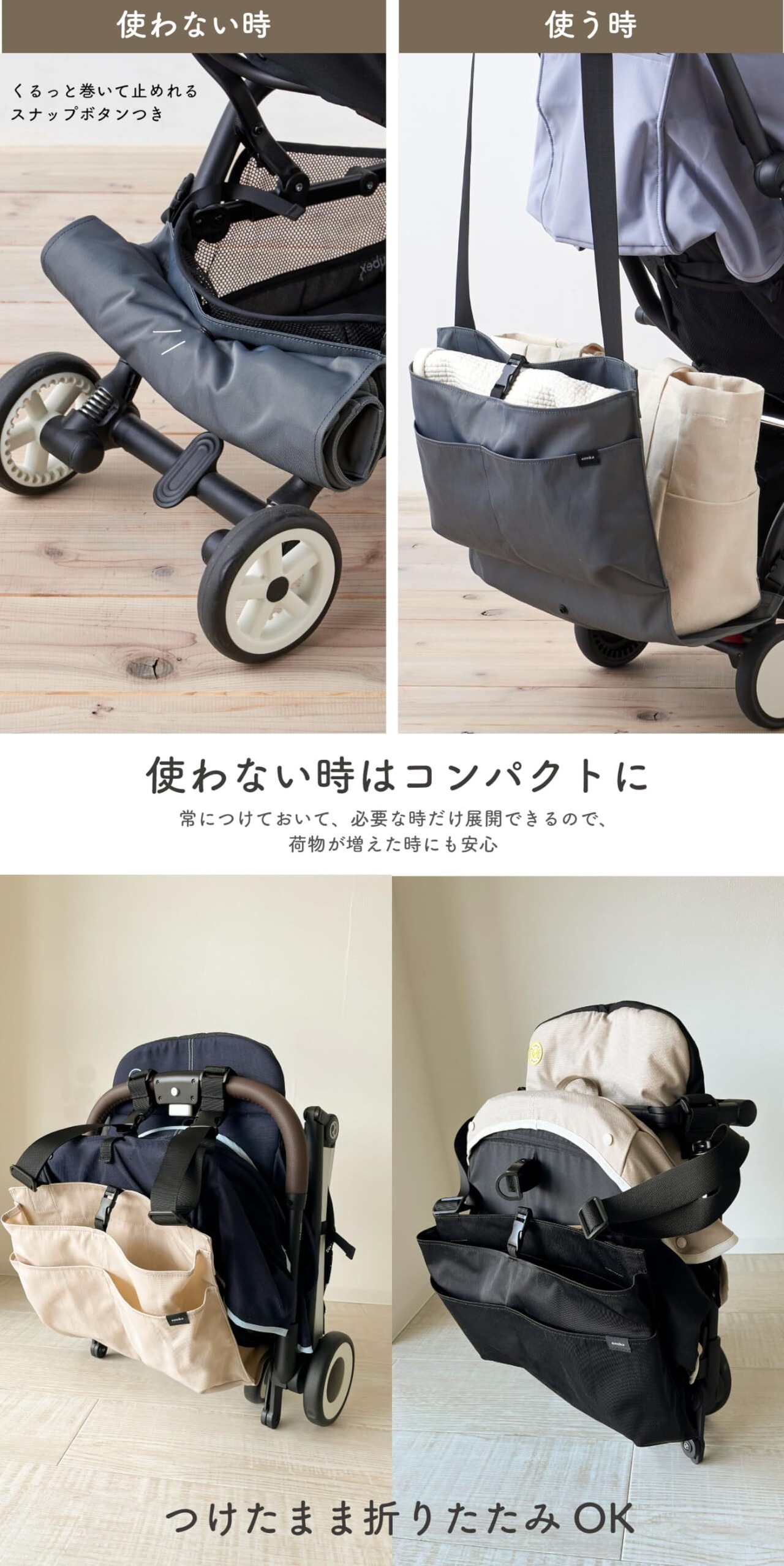 ベビーカーの収納力UP、ハンモックタイプのベビーカーアンダーバッグ。スーパーのお買い物の際、カゴを置くことができるので便利です。ポケットにはマチがあり、おむつポーチなどベビーとのお出かけに必要なアイテムを入れておくことができます。つけたままベビーカーを畳むこともできます。
