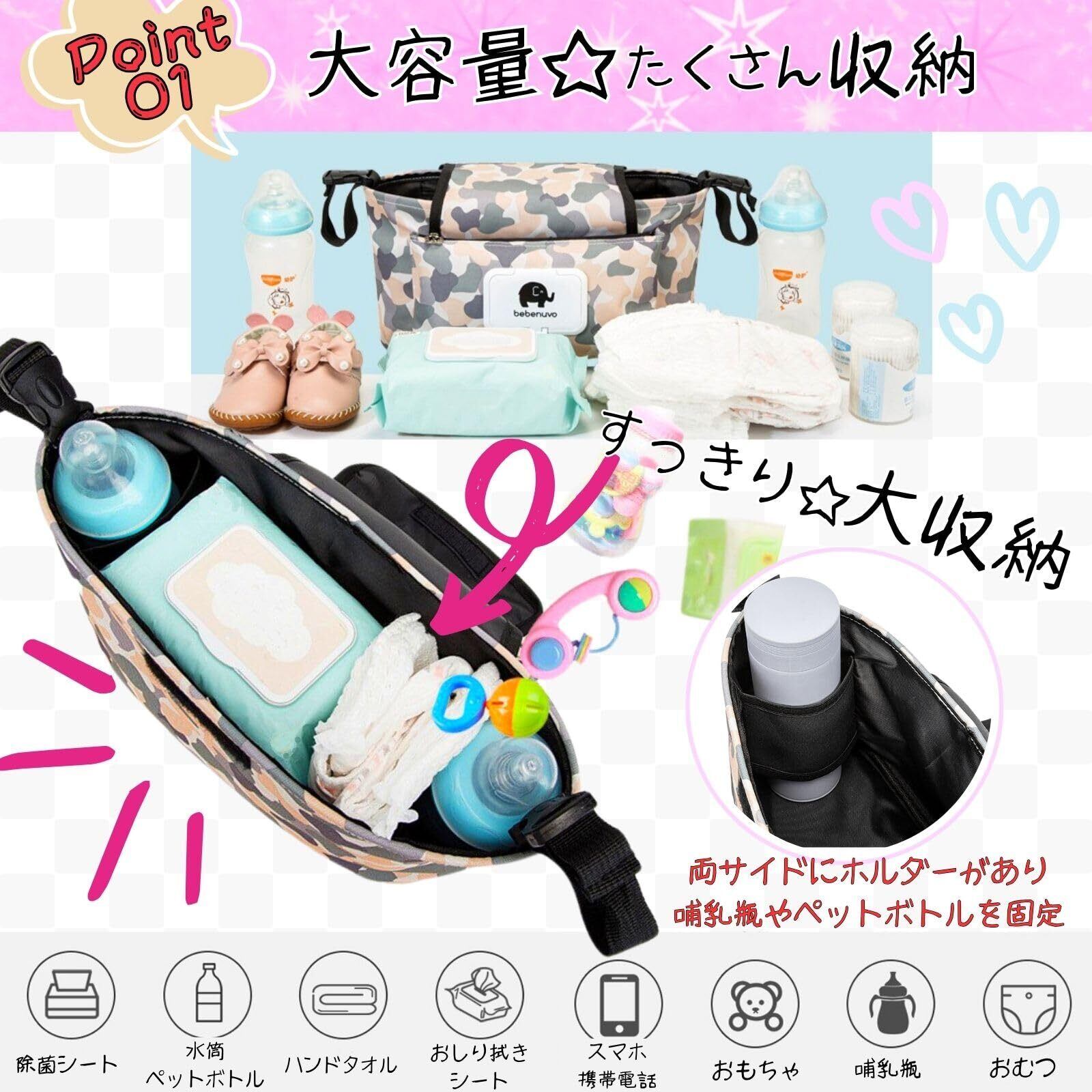お出かけの際、たくさん大容量収納できる便利なベビーカーバッグです。