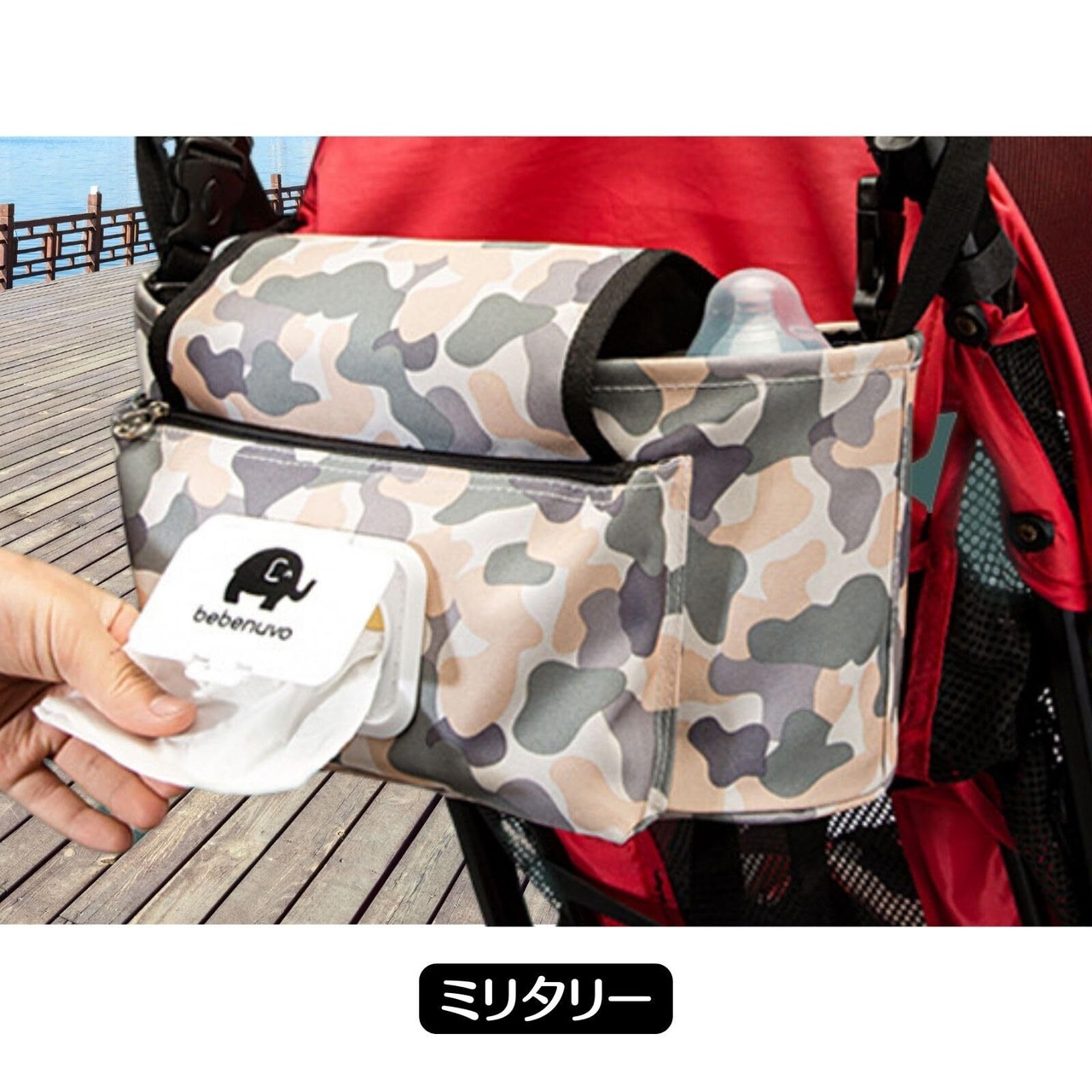 サイドポケットにおしり拭きシートを収納できサッと取り出せます。
