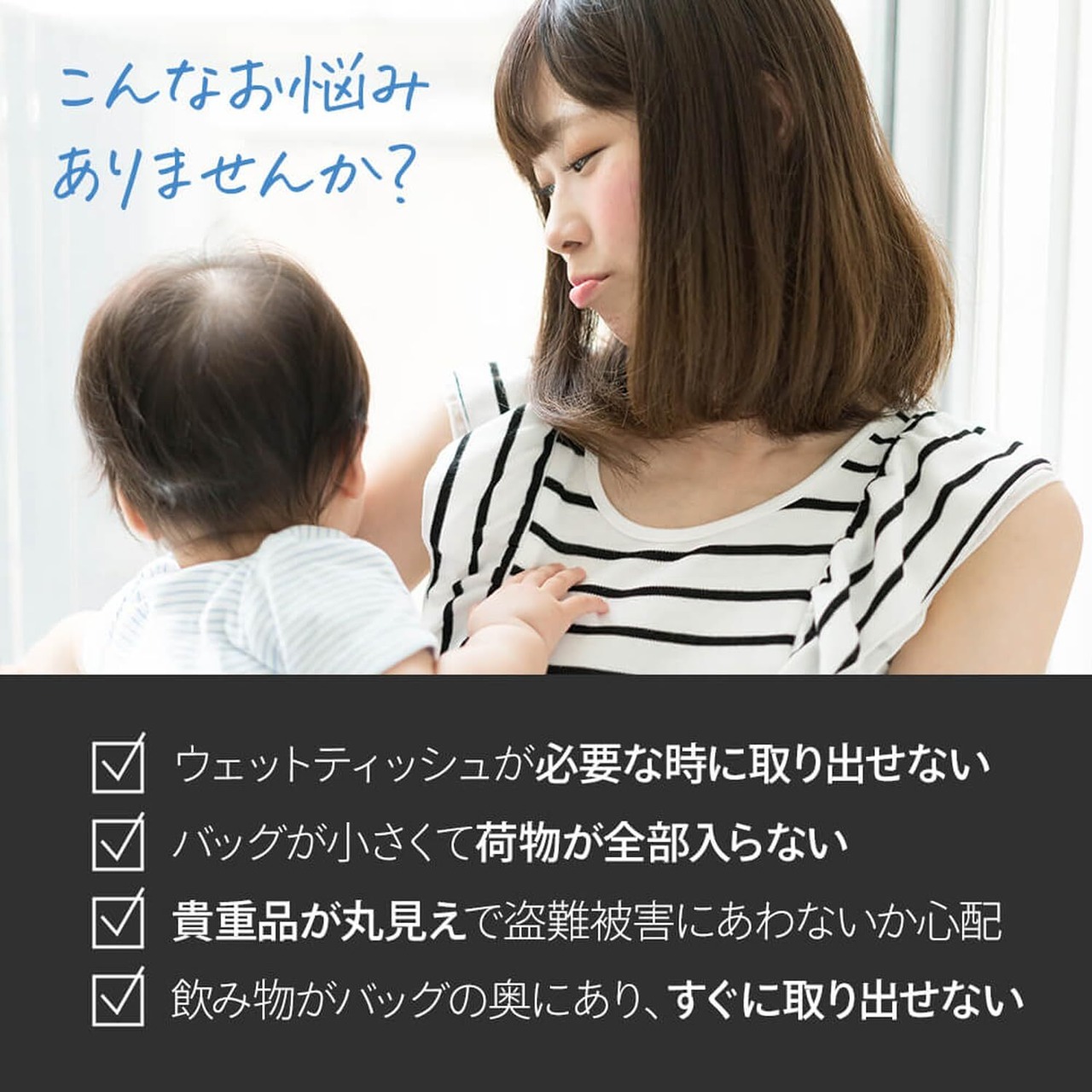 おむつ、哺乳瓶、おもちゃ、さらにはウェットティッシュまで、育児に必要なアイテムをたっぷり収納できるスペースを確保しています。ポケットが豊富に配置されており、小物の整理も簡単!必要なものをすぐに取り出せるのが魅力です。「※この商品に関するご質問がございましたら、お気軽にお問い合わせください。」