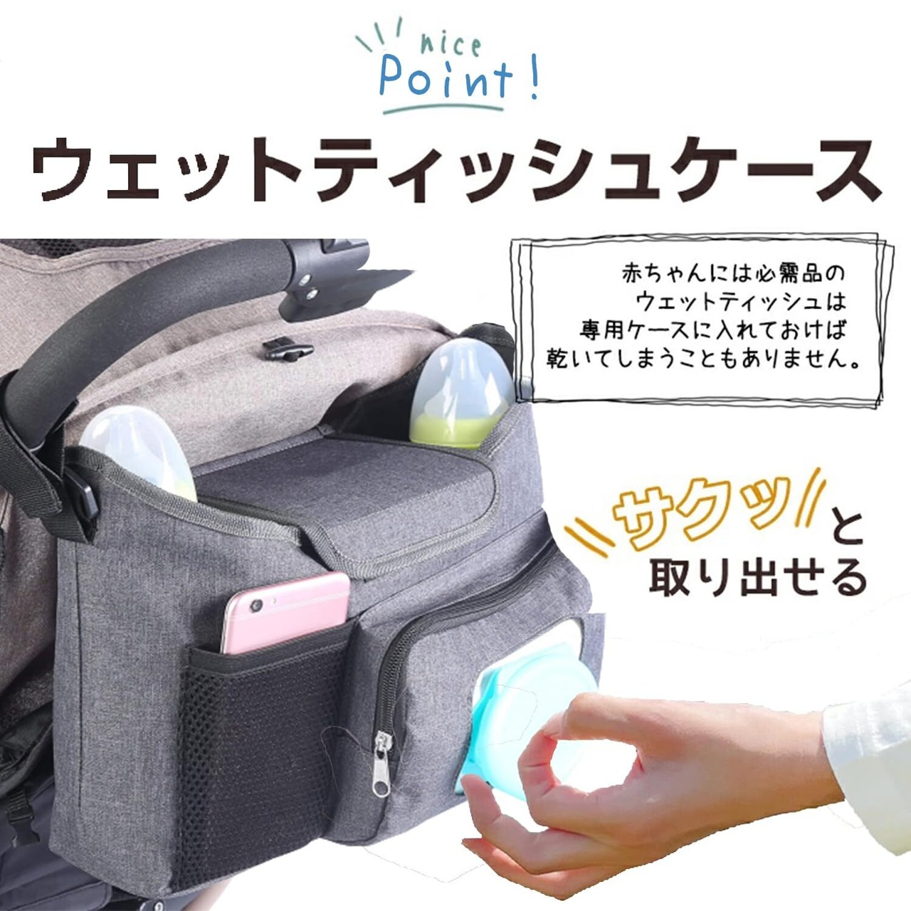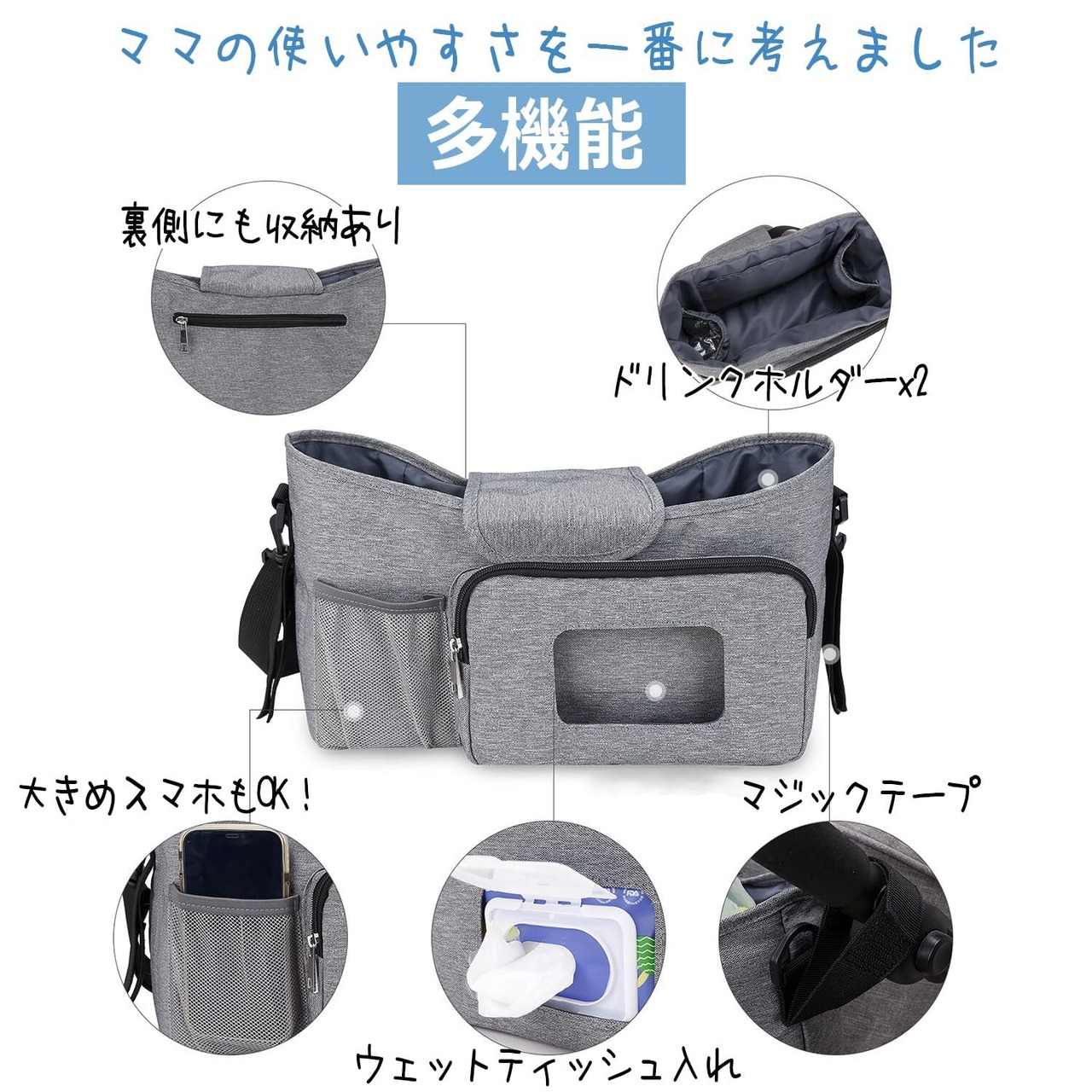 多用途に使える:欲しい物がすぐに取り出せる大容量のベビーカーバッグです。ベビーカー以外にもカーシートやベビーベッドにも取り付け可能です。