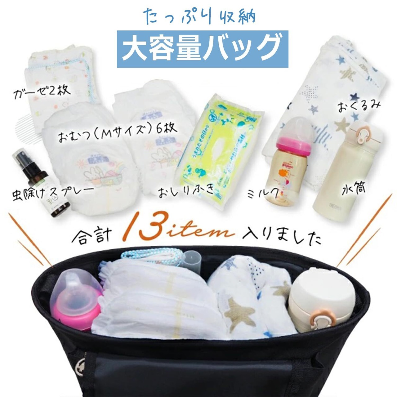 コンパクトなのに抜群の収納力:オムツ、おしりふき、哺乳瓶、水筒、おくるみ等・・・赤ちゃんやお子様とのお出かけに必要な物が全て入る大容量でこれ一つあればOK。