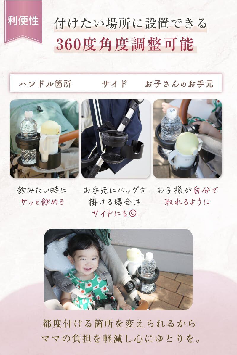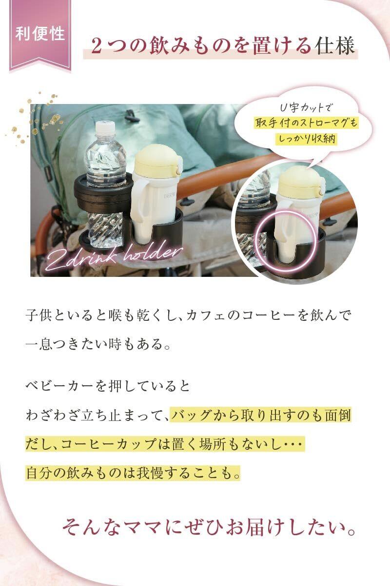 「sezu ベビーカー ドリンクホルダー」は、育児をもっと便利にするために設計された必需品です!スタイリッシュなブラックカラーは、さまざまなベビーカーにマッチし、外出時の飲み物を安全におさえてくれます。