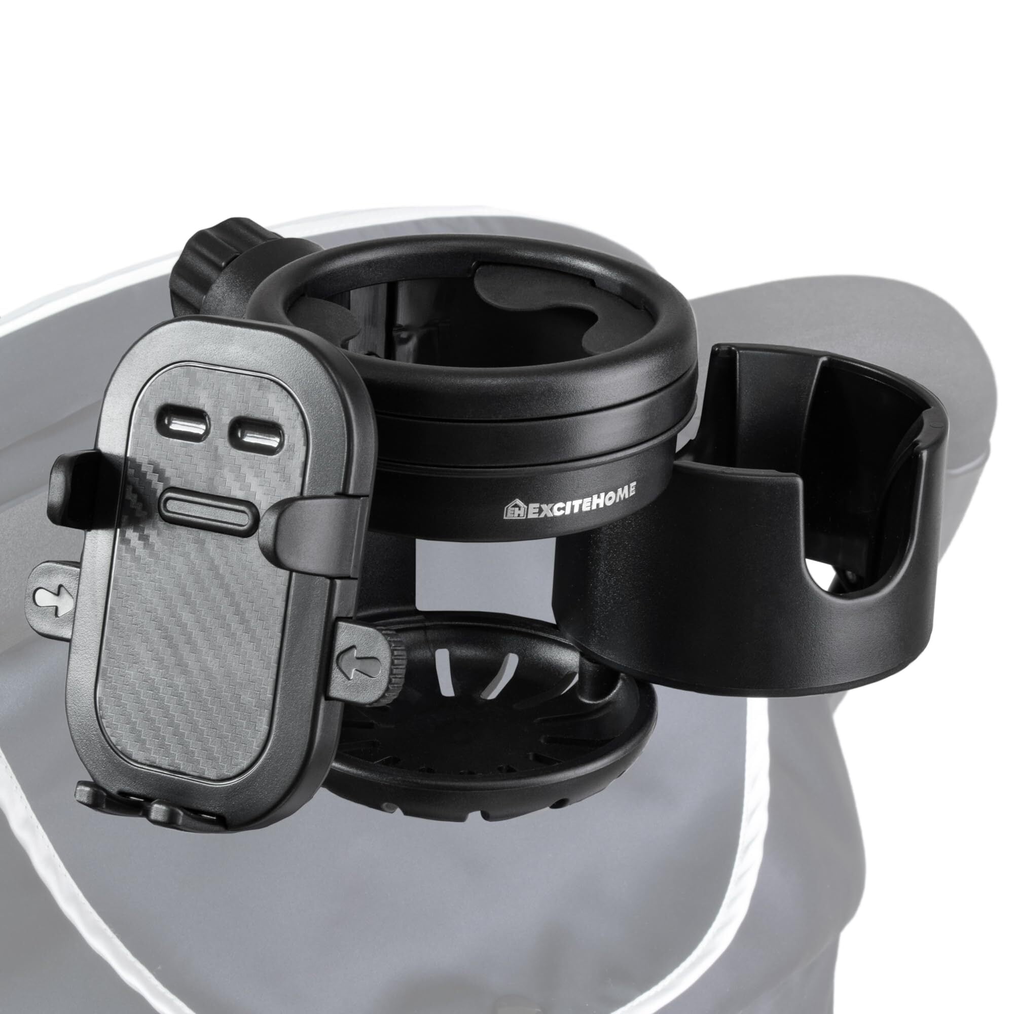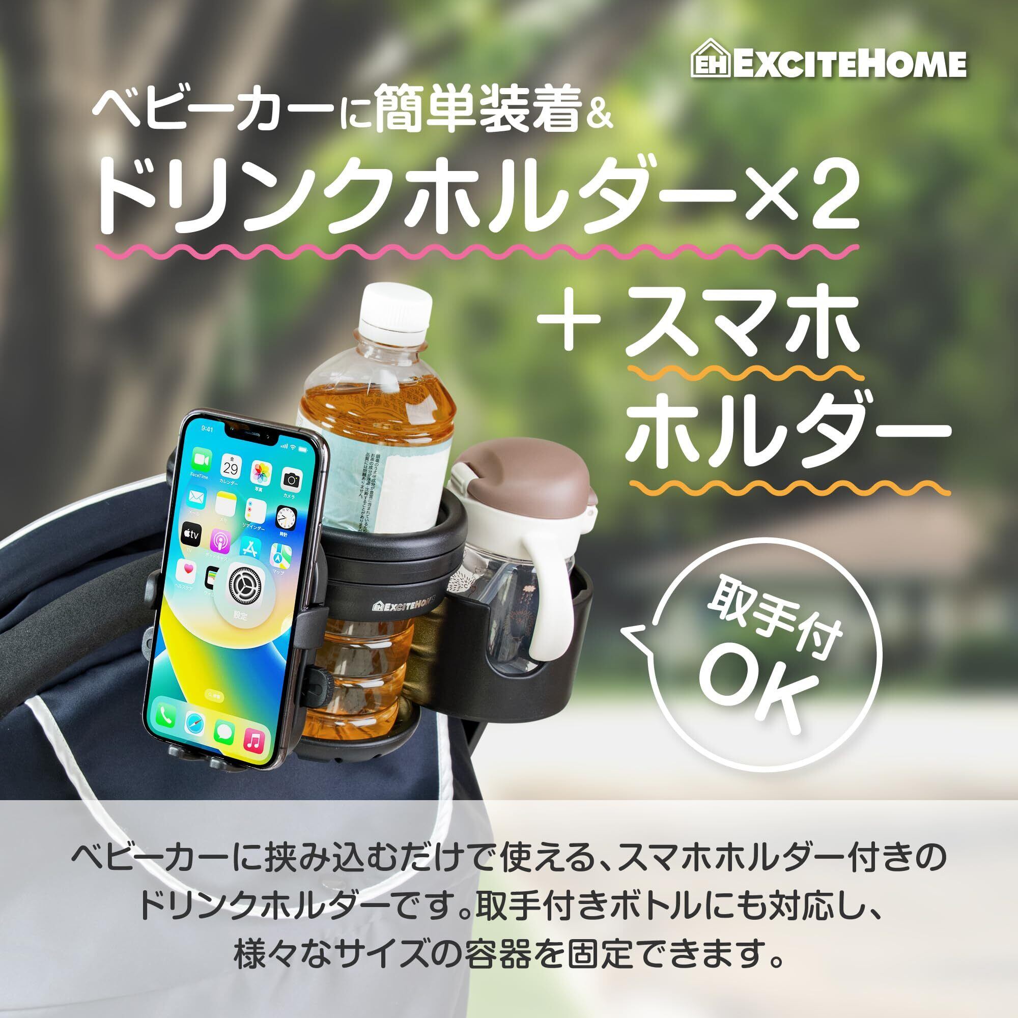 【現役保育士監修】EXCITEHOME ベビーカー ドリンクホルダー(2個) スマホホルダー スマホ 携帯 ホルダー 哺乳瓶 取手付きボトル 水筒 ボトルホルダー 360度回転 角度調整可能 取付簡単 収納 おでかけ 快適 便利 3-IN-1