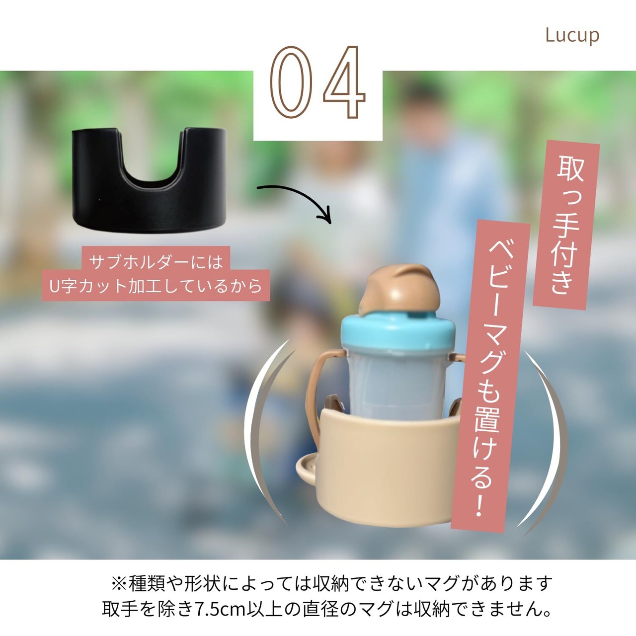 【動きに強くベビーマグも置ける】ホルダーにはストッパーを搭載しているので段差の衝撃等、突然の動きにも強くなっています。また、U字カット加工をしているのでベビーマグにも対応しています。