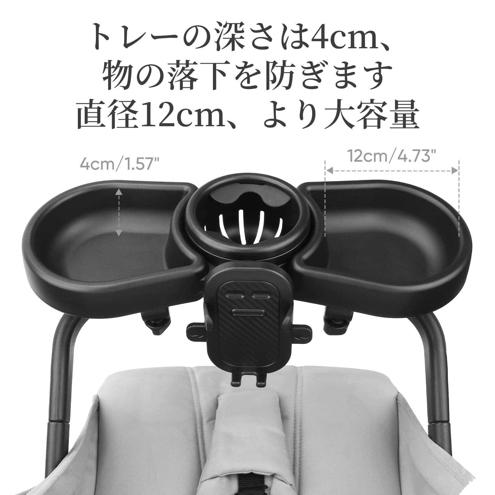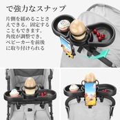 トレイ部分は360度回転可能なので、自分の使いやすい位置に簡単に調整できます。お散歩中のおやつタイムや、お子様が飲み物を飲むときにも、大変便利です。
