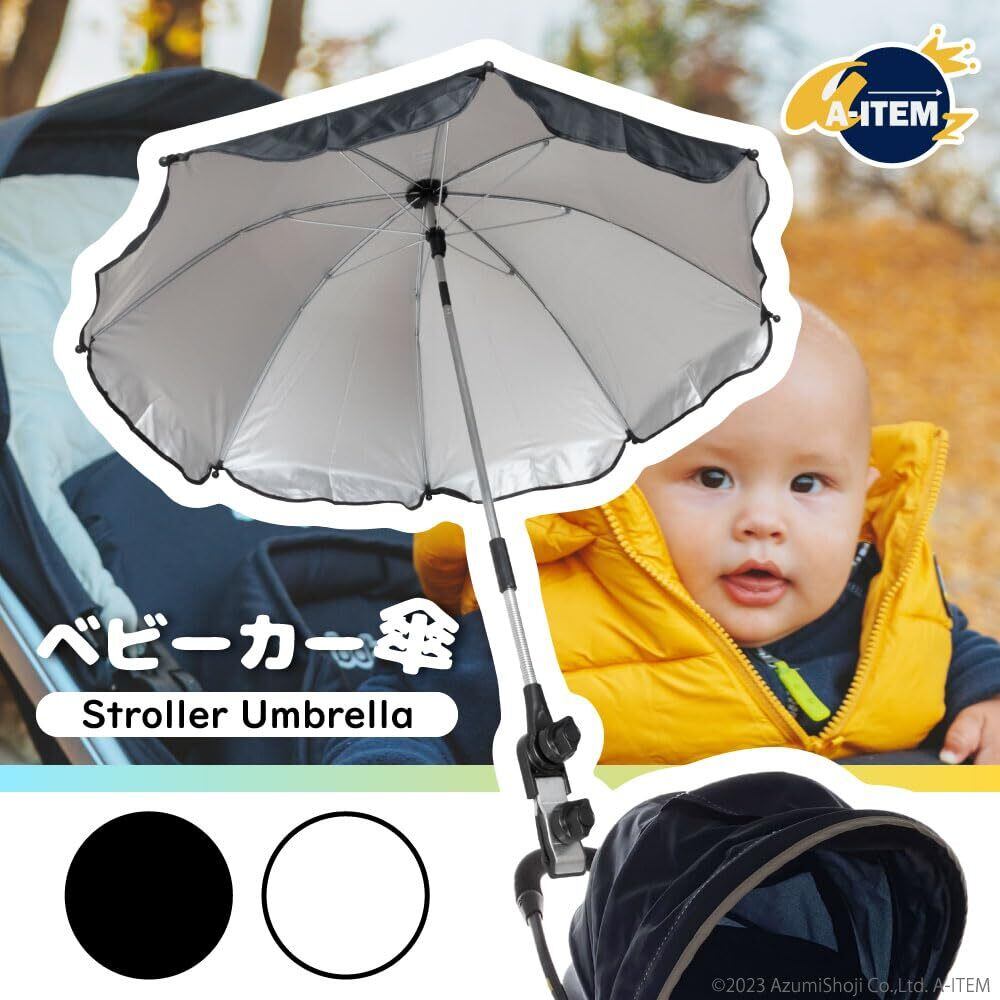 A-ITEM ベビーカー傘 ブラック ホワイト 赤ちゃん ベビーカー 取り付け アンブレラ 日よけ サンシェード 折りたたみ 傘固定 パラソル 紫外線 対策 夏 UVカット 熱中症 お出かけ 両用 (ブラック)