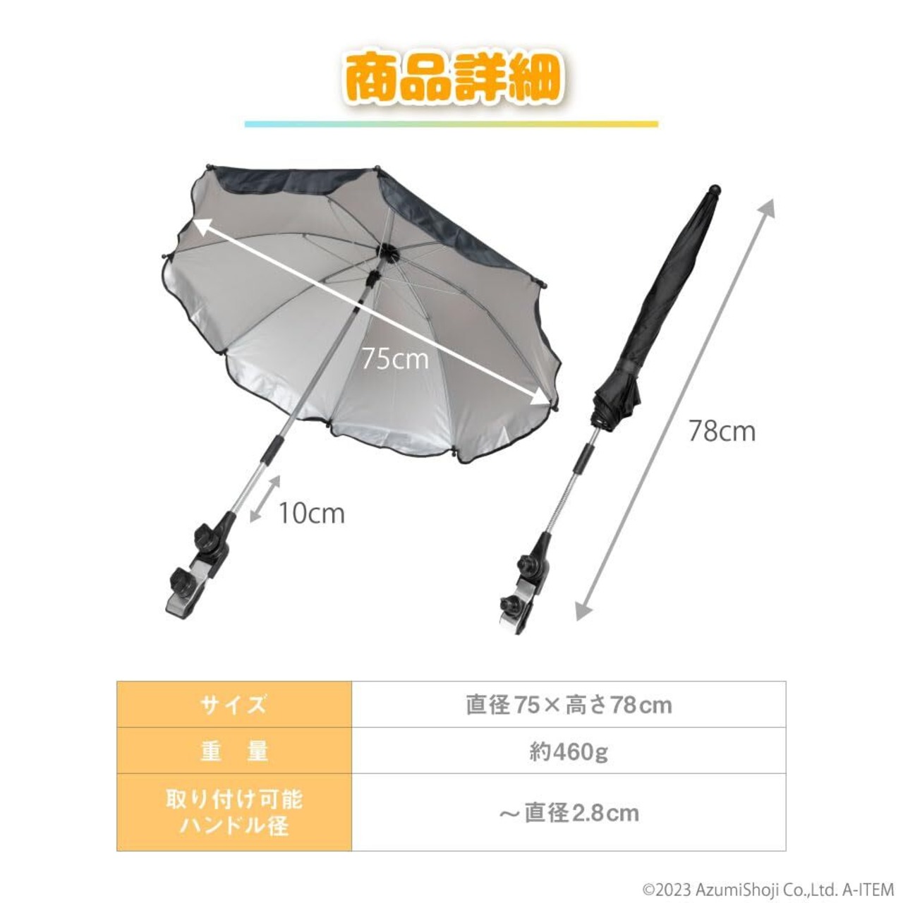 「A-ITEM ベビーカー傘」は、赤ちゃんを強い日差しから守るために設計された必需品です!使いやすさと機能性を兼ね備え、安心してお出かけを楽しむための理想的なアイテムです。