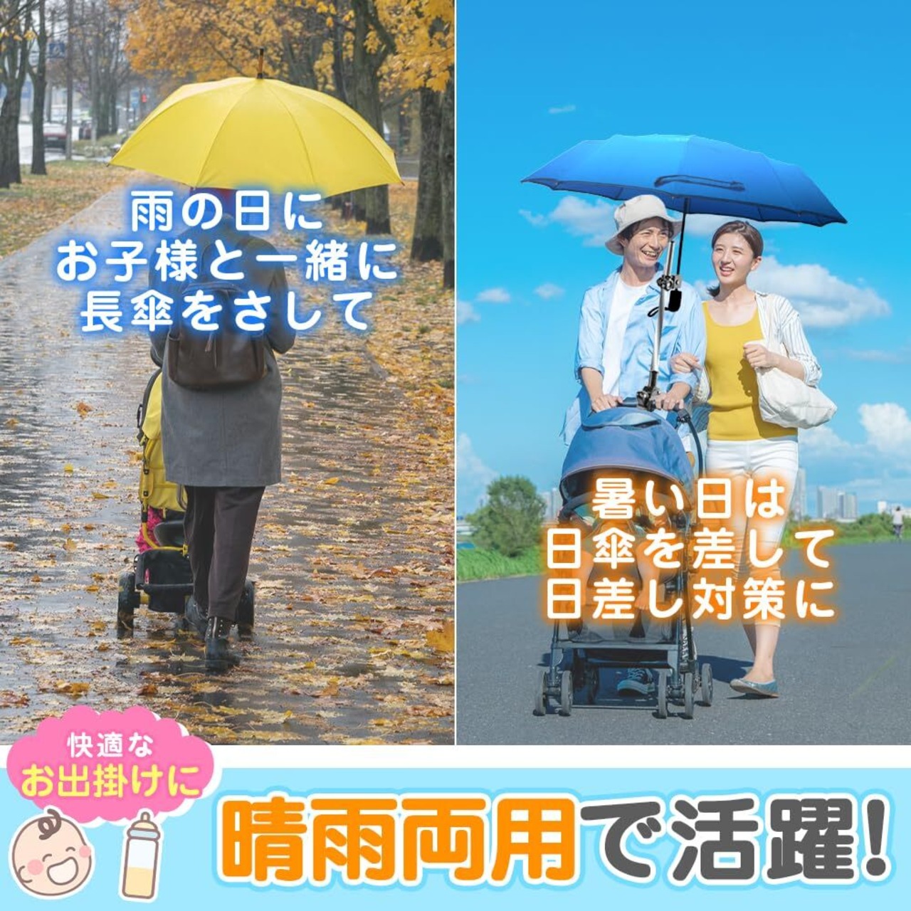 ベビーカーに簡単に取り付けられる設計で、幅広いモデルに対応します。傘の固定も安定しており、風が強い日でも安心してご使用いただけます。外出先での急な取り付けにも便利です!