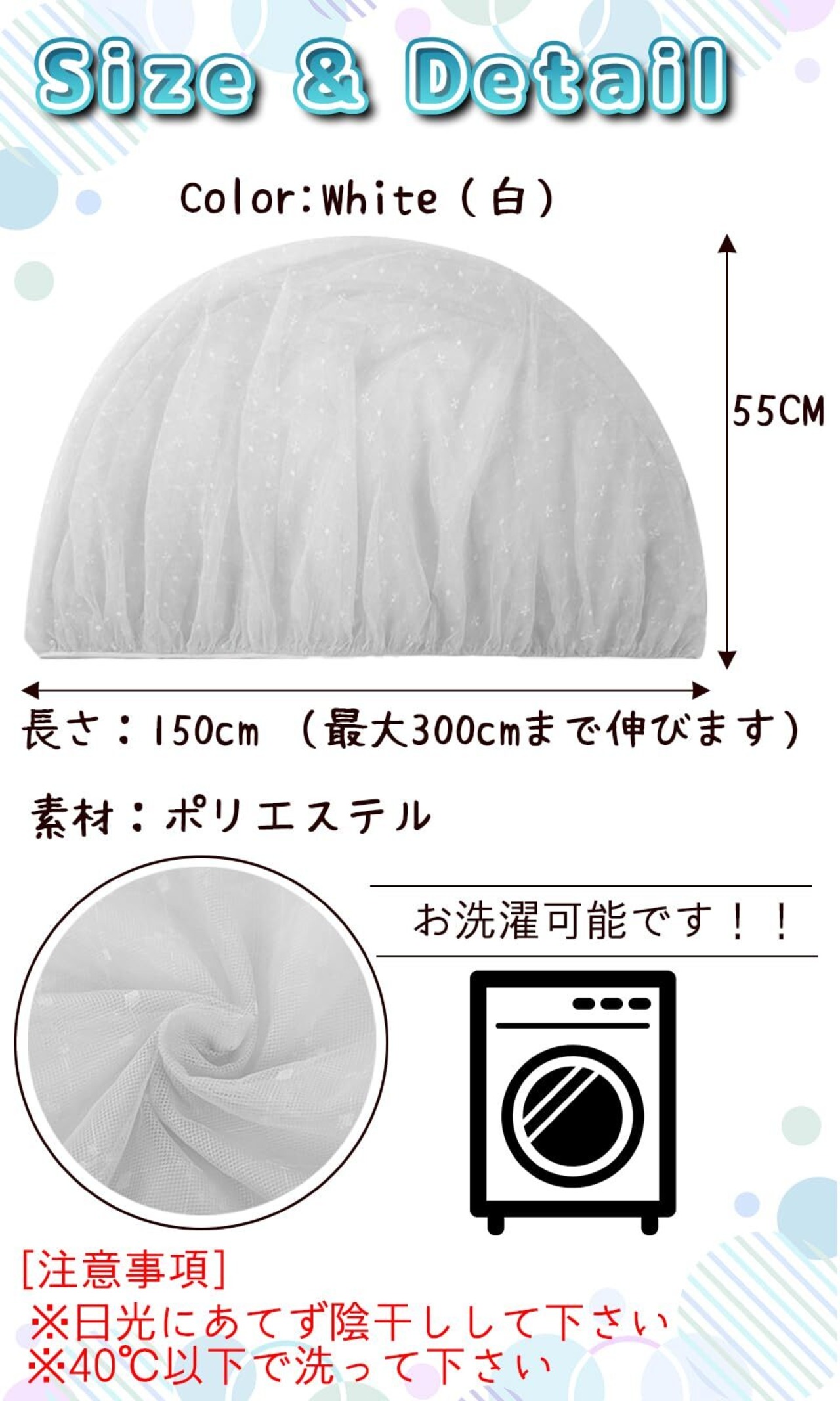 直径150cm(最大300cm)、赤ちゃんを虫から守るメッシュカバー: ポリエステル製のメッシュカバーは、直径150cm(最大300cm)まで伸びます。